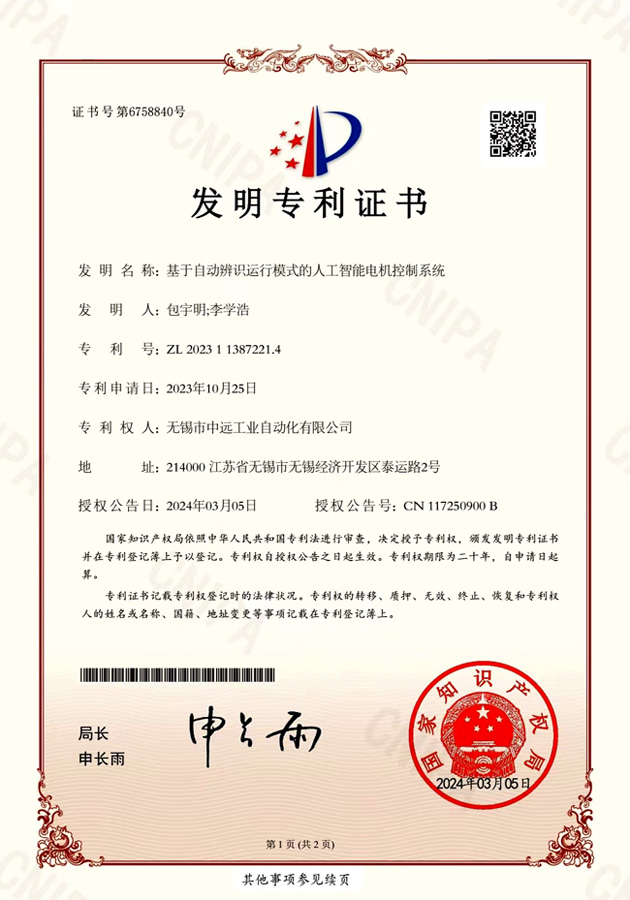 熱烈祝賀中遠(yuǎn)公司人工智能電機(jī)控制技術(shù),獲得國(guó)家發(fā)明專(zhuān)利!