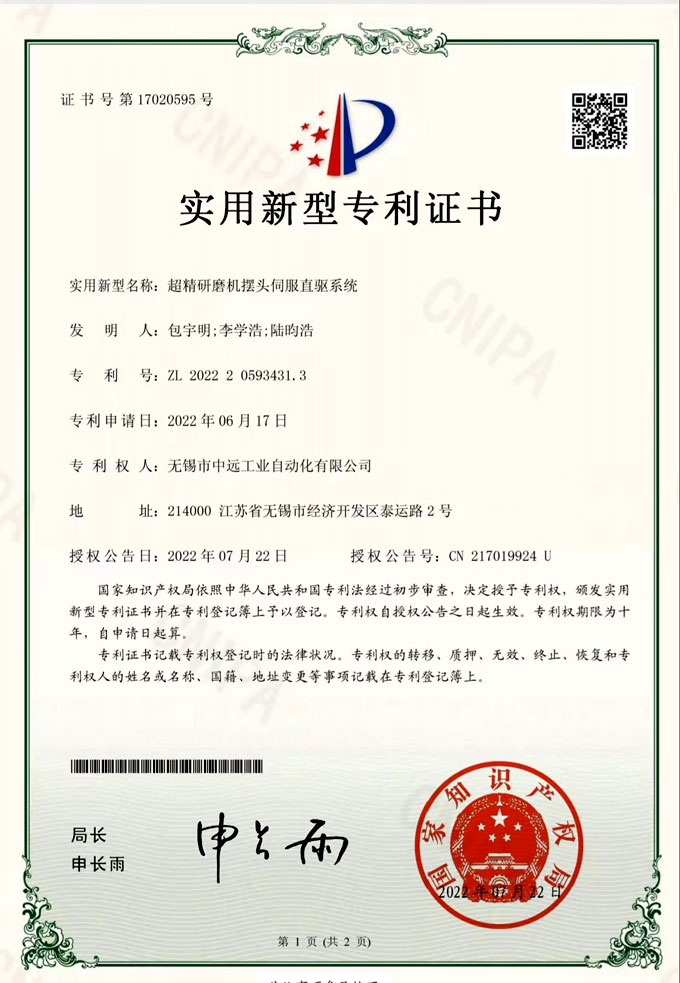 祝賀中遠(yuǎn)自動化公司擺頭直驅(qū)伺服系統(tǒng),榮獲國家專利